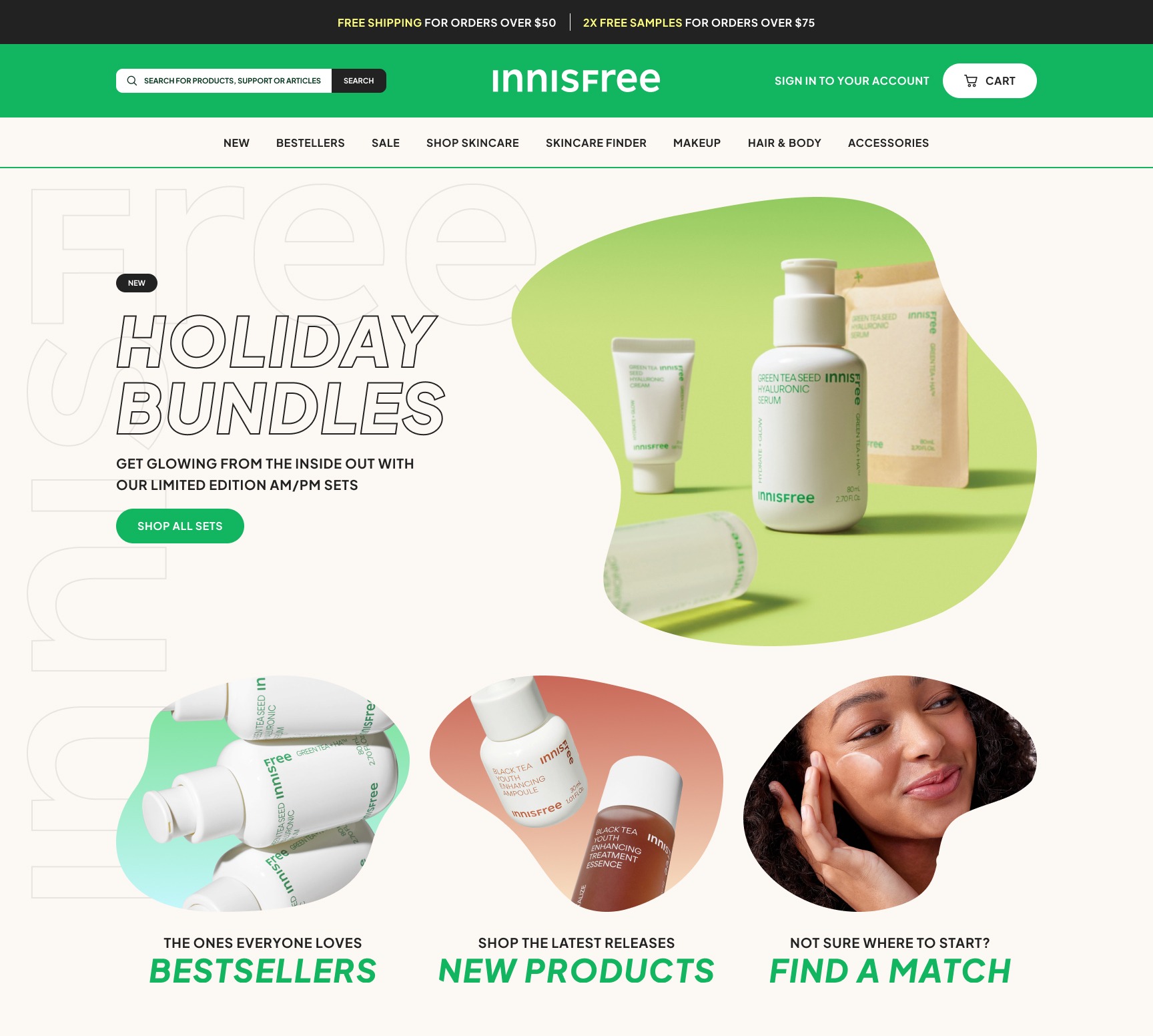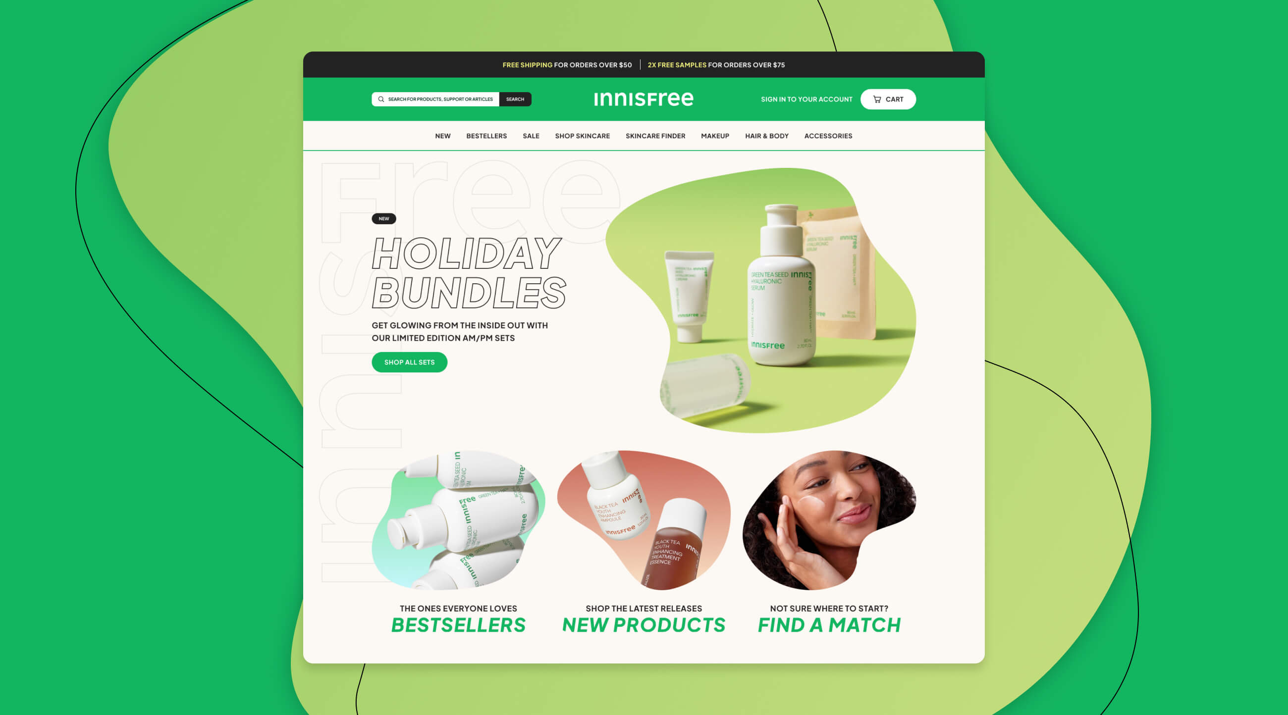 In these concepts for the homepage, product page and a skincare finder tool, the goal was to push their branding to the max, exploring how far I could take their bold typography and gradients. I explored using organic masks and shapes to offset the structure of their chosen typeface. I brought back into the homepage story of the brand and signature ingredient, Jeju Island Green Tea, unique to Innisfree.