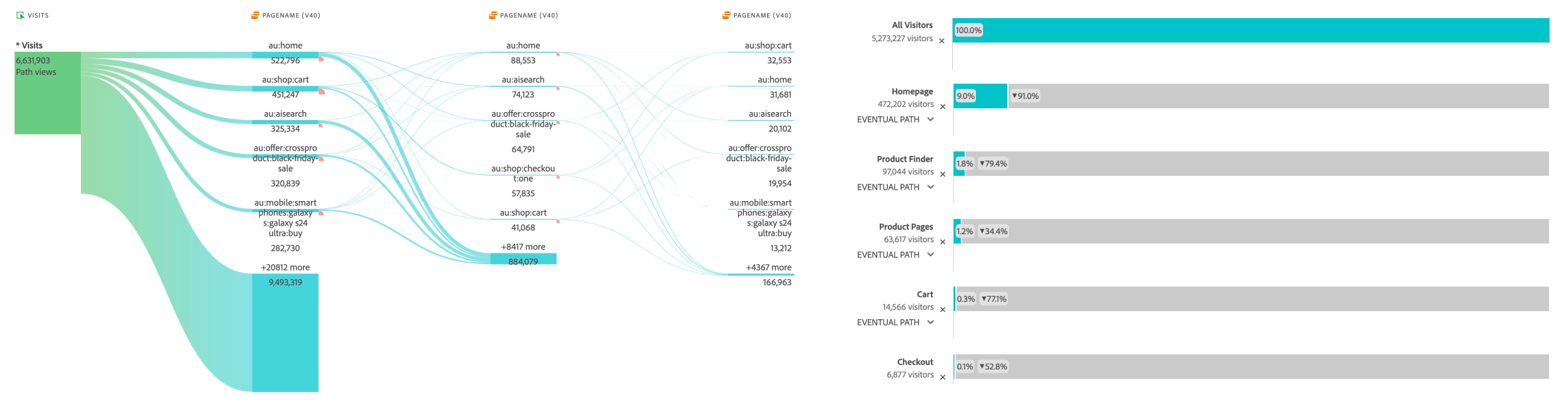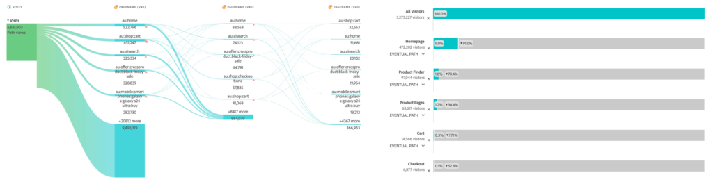 Working for Samsung, I was lucky enough to have access to the Adobe Experience Cloud’s suite of tools: Adobe analytics, experience manager and target. Using adobe analytics as the first point of reference, researching and hypothesising for new A/B tests begin with consulting the data to map out current user journeys across the website and mapping out our desired user journeys to see where in the funnel users were dropping off, progressing and returning.