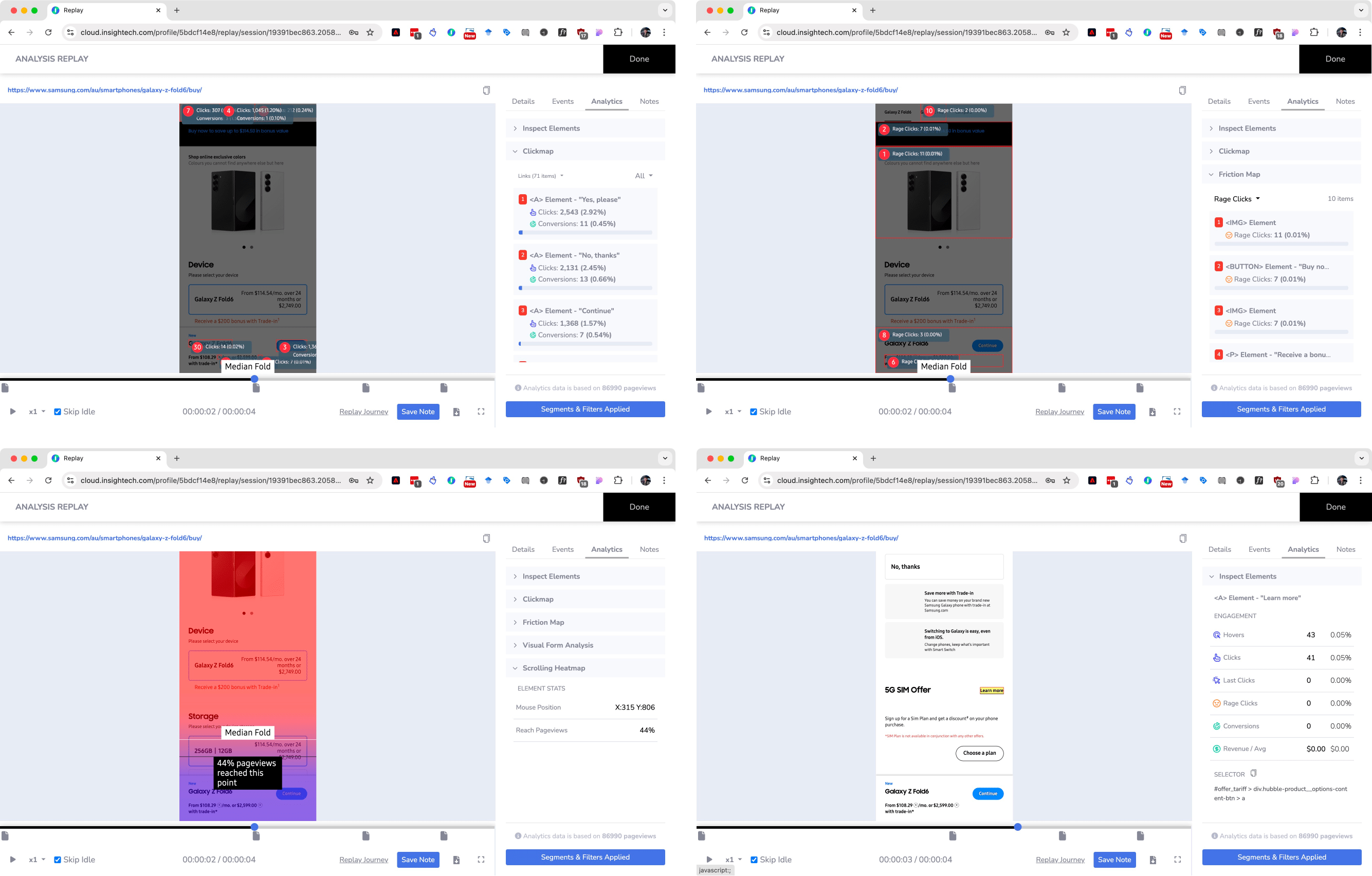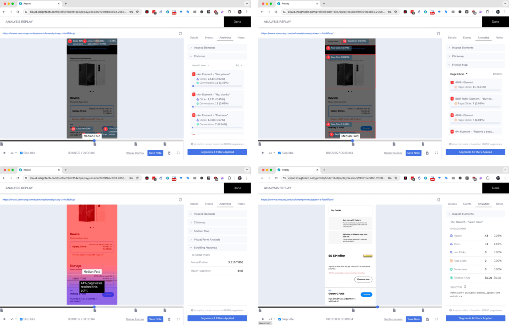 We then zero-in on areas that have a high-amount of traffic or are underperforming (or both) and observe user behaviour in Insightech and look at the metrics for those areas.