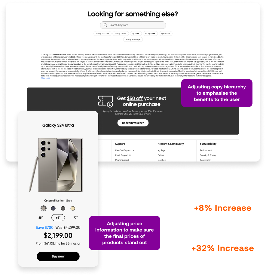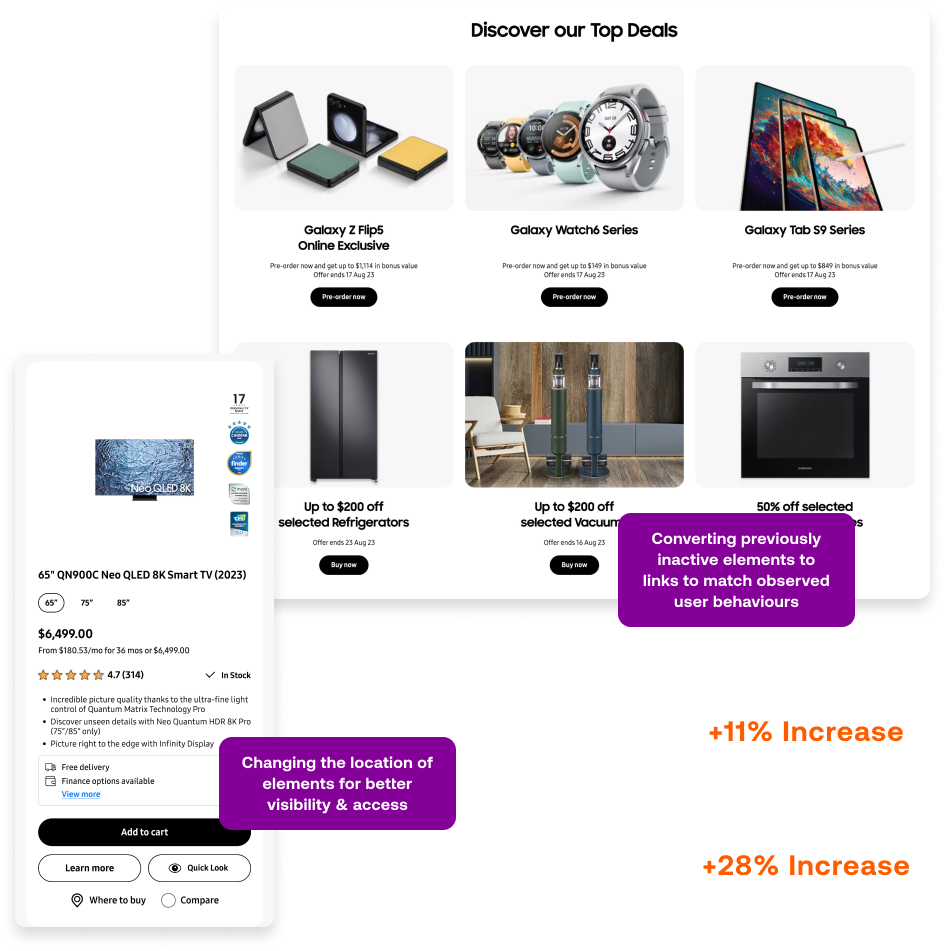 By tweaking the navigation, making the nomenclature more explicit and specific to the pages they link to & re-organising elements on high-traffic pages, we made improvements to the click-through-rate, orders & revenue of the website, giving Samsung customers what they want, when they want it.