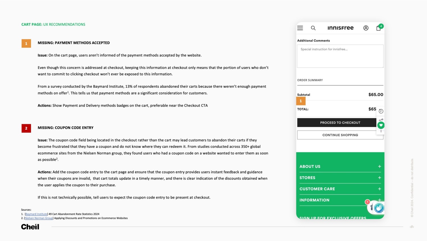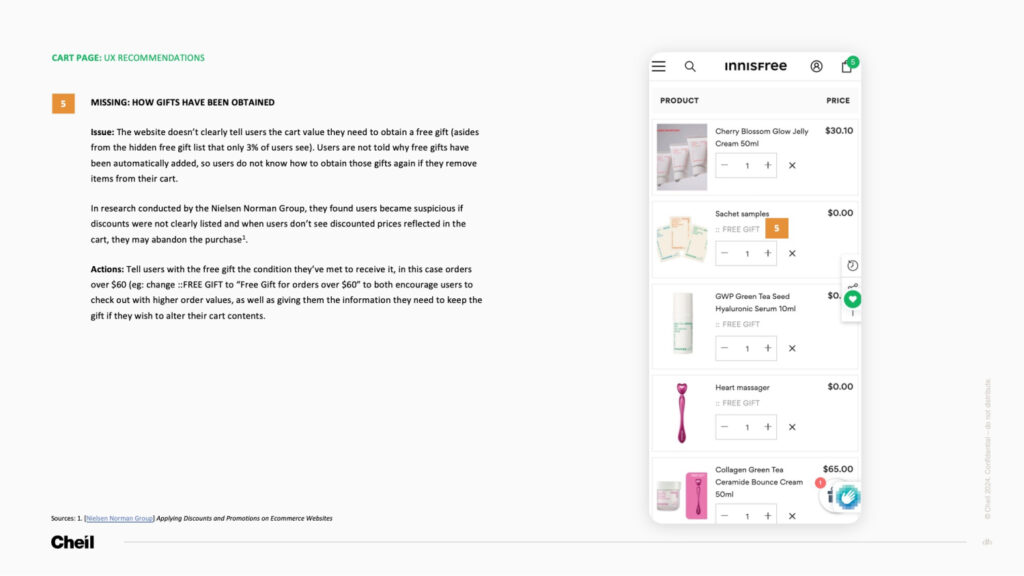 Paired with screenshots of the current website and markups denoting where the issue has been observed, the Innisfree audit delivered an insight and a paired action for each identified problem, and prioritised them based on development effort and impact in a backlog ready for implementation from the client.