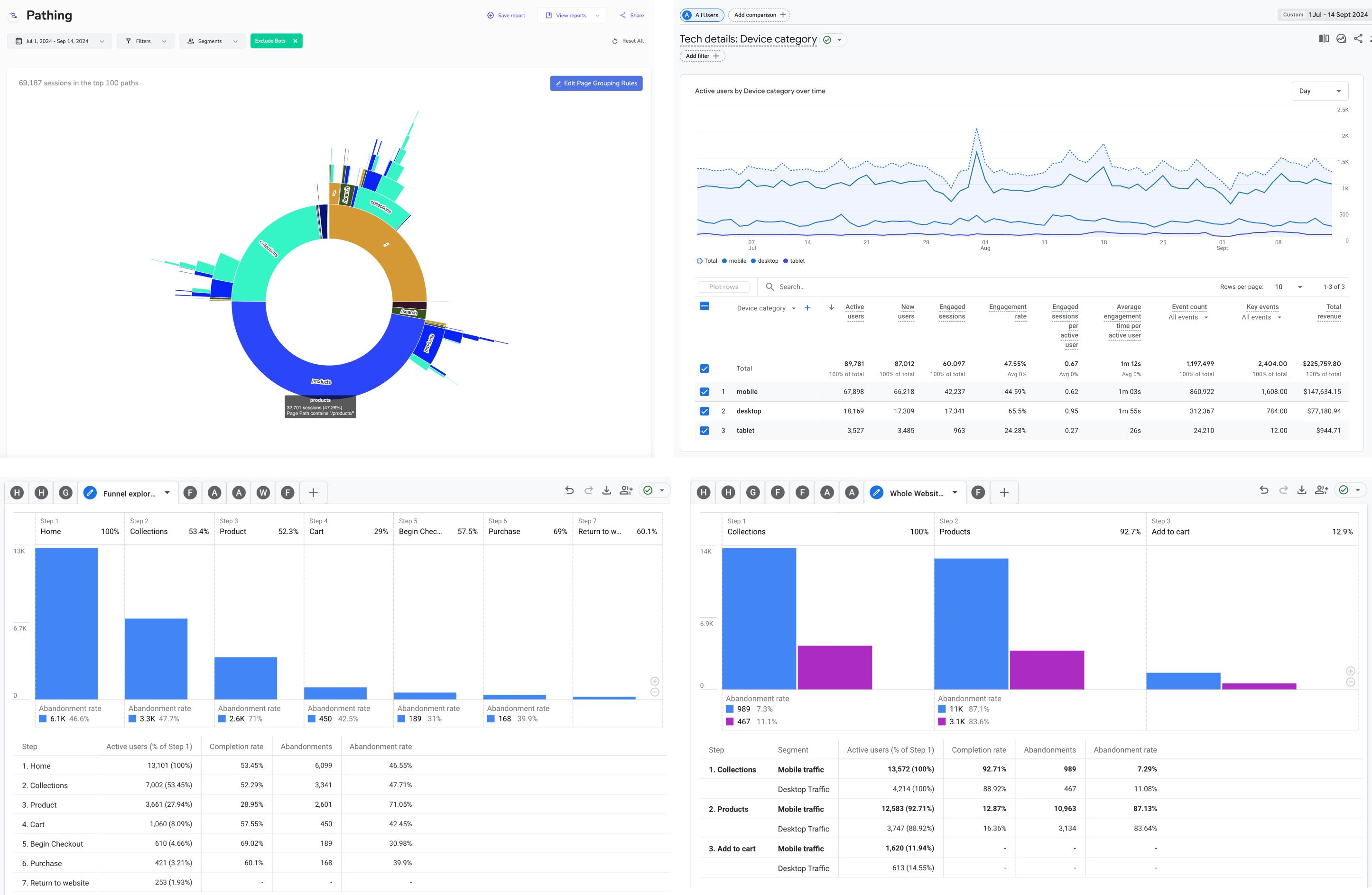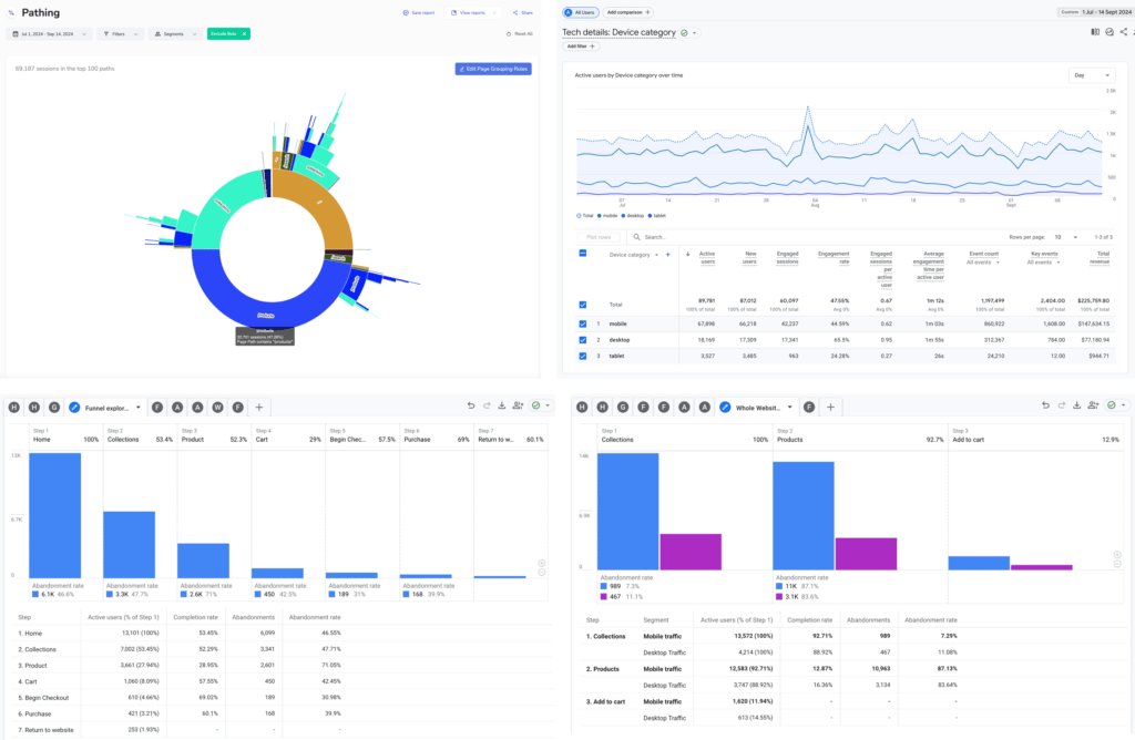 Our inital data analysis revealed that users on mobile devices were in the majority at 70%, they were having the worst user experience out of desktop and mobile devices and the website funnels we generated highlighted the exceptionally high drop-off rate from the cart page, with an 85%+ abandonment rate. We also discovered users were entering the website mainly at product pages, from paid search and organic search channels.
