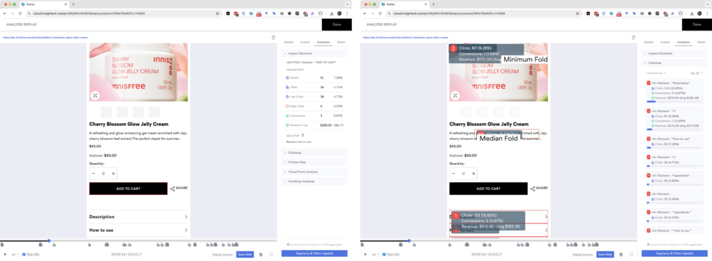 This excersise conducted across all page templates in the website, reveal valuable insights on user behaviour not previously considered by the client. For example, our behaviour analysis uncovered that users weren’t being exposed to the many fantastic ratings and reviews the products receive, that users desired to read the description, but would get frustrated when they couldn’t close the modal, and that content that would work well to convert users (free gifts with purchase information) was effectively hidden by singular and somewhat vague icon that would often be hidden by the user’s thumb whilst scrolling.